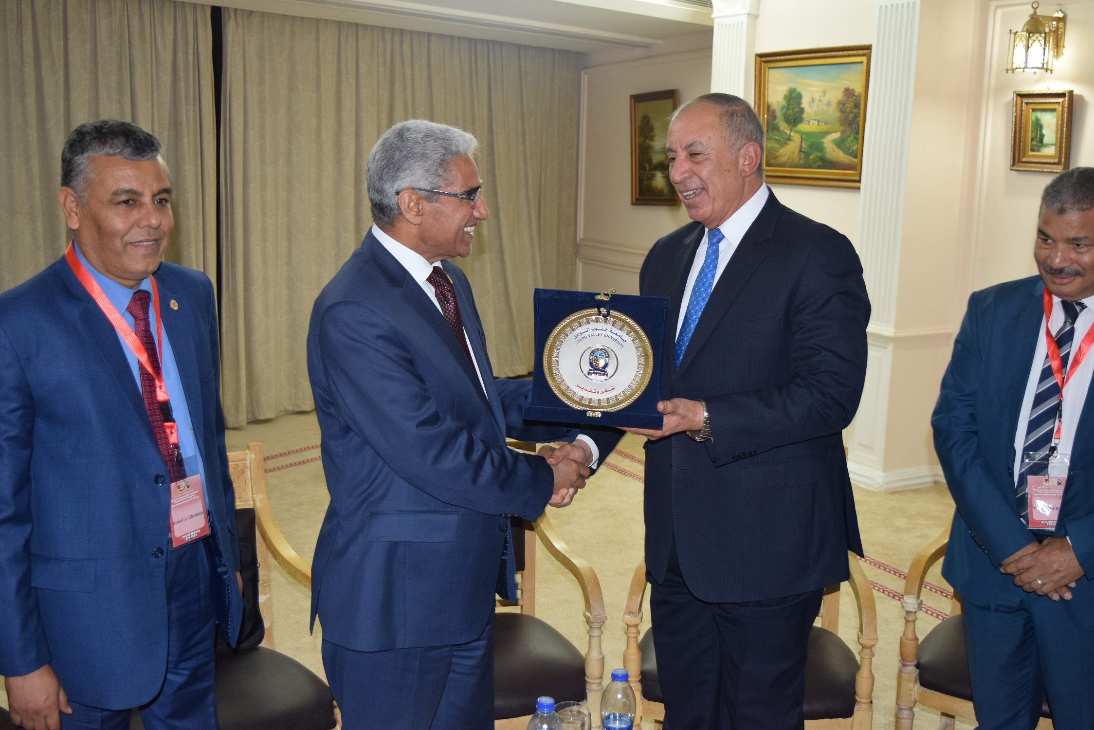 وفي نهاية الجلسة الافتتاحية أهدى الدكتور عباس منصور رئيس جامعة جنوب الوادي درع الجامعة والمؤتمر إلى اللواء احمد عبد الله محافظ البحر الأحمر كما أهدى رئيس الجامعة درع المؤتمر إلى رموز أقسام الجراحة العامة من الحضور.