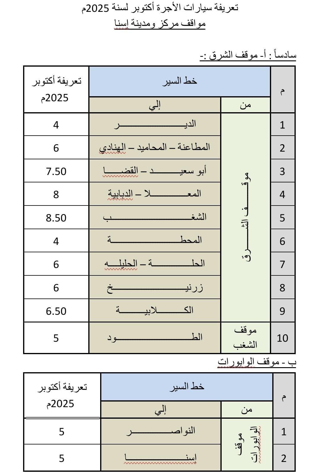 وفيما يلى بيان بالتسعيرة الجديدة لكافة الخطوط والمواقف من وإلى الأقصر