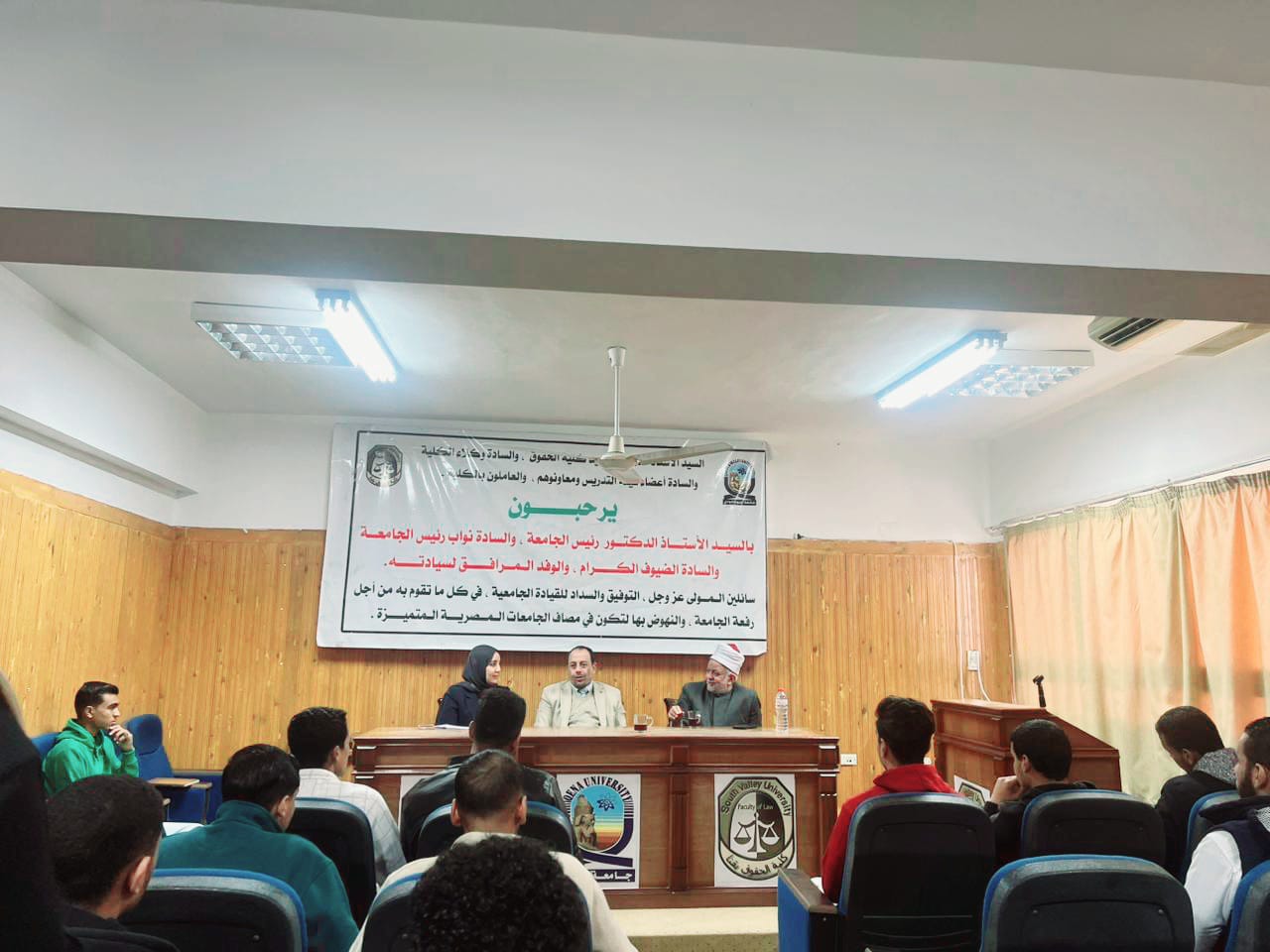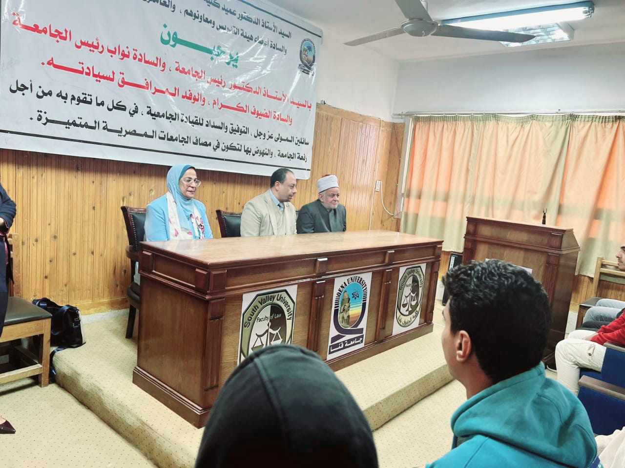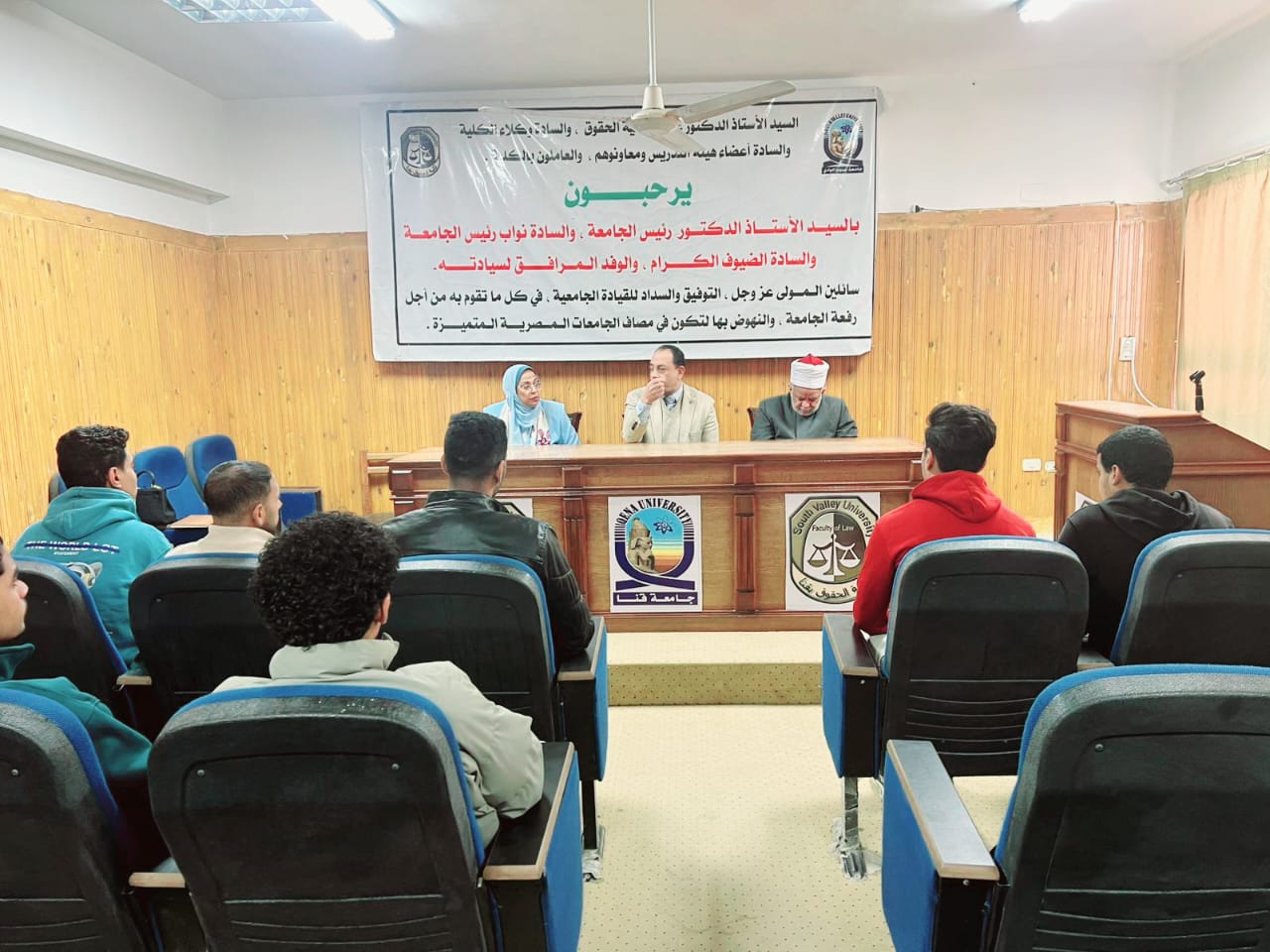نظمت أسرة "طلاب من أجل مصر" بكلية الحقوق، بجامعة قنا ، بالتعاون مع المجلس القومي للمرأة ندوة بعنوان "نحو وعي مجتمعي مستنير"، تحت رعاية كل من الدكتور أحمد عكاوي، رئيس الجامعة، والدكتور محمد سعيد، نائب رئيس الجامعة لشئون خدمة المجتمع وتنمية البيئة، والدكتور أشرف موسى، نائب رئيس الجامعة لشئون التعليم والطلاب، والدكتور عبد الباري سليمان، عميد كلية الحقوق، والدكتور عباس مصطفى، وكيل الكلية لشئون التعليم والطلاب.