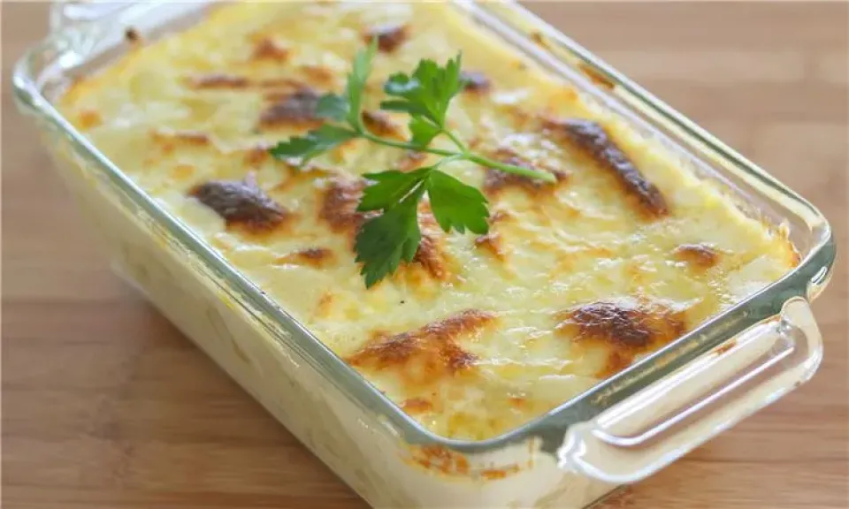 أدخلي الصينية الفرن لمدة 15 دقيقة حتى تتحمر الوجهة ويصبح لونها ذهبيًا.